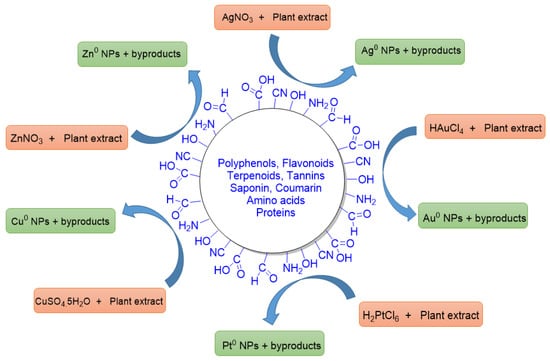 When PDMNPs are synthesized, the bioactive compounds found in plant extracts provide great stability, reduce the clumping, as well as inhibiting the agglomeration, which promotes good dispersion and more active sites in the suspension [51]. These bioactive compounds have a variety of functional groups, including carboxylic acid (-COOH), aldehyde (-CHO), hydroxyl (-OH), nitrile (-CN), and amines (-NH2), which are engaged in reducing metal ions into free metals (Figure 4) like Ag+ → Ag0, Au+ → Au0, Cu2+ → Cu0, Zn2+ → Zn0, and Pt+ → Pt0 [52]. Bioactive compounds also improve the adsorption ability of NPs by increasing the surface area of PDMNPs through molecular interactions such as electrostatic interaction, dipole–dipole induction, π–π interaction, and hydrogen bonding [53]. According to research studies, functional groups of bioactive compounds are involved in reducing the energy gap in metals, which promotes electron release and makes it easier for free radical species to develop. They may readily pass through the cell membrane of pathogens and other host cells followed by killing the diseased cells and as a result, they exhibit a variety of biological activities such as antioxidant and anticancer [54]. In some studies, polyphenols and flavonoids form a capping layer around the NPs via electrostatic interactions, which increases the PDMNPs’ ability to bind to bacterial cell surfaces [55]. Copper-based PDMNPs have been synthesized by using Cu(NO3)2 salt and plant extracts. In these studies, the bioactive compounds such as anthraquinone glycosides, tannin, and quercetin contained in plant extracts have been found to play key roles in enveloping and stabilizing the PDMNPs by reducing Cu2+ ions into Cu0 form [56,57]. Furthermore, Kumar et al. reported the formation of highly stable Zn nanoparticles when they used a suspension of Citrus paradisi peel extract and zinc oxide. Following these studies, researchers found that the hydroxyl and carboxyl functional groups of flavonoids, carotenoids, and limonoids were involved in reducing the Zn2+ ions into Zn0, a zero valent state [58]. Moreover, Kesharwani et al. demonstrated that alkaloids, amino acids, and sugar compounds reduce Ag+ to Ag0 [59]. Therefore, these investigations supported the significance of bioactive compounds in the synthesis of PDMNPs by demonstrating how they operate as reducing, capping, and stabilizing agents.