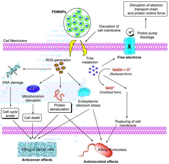 The representation of pathways involved in oxidative stress-mediated anticancer and antimicrobial properties given by PDMNPs.