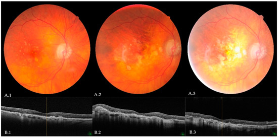 Ocular fundus retinography (A.1–A.3) and spectral domain—optical coherence tomography (B.1–B.3) showing the progression from intermediate to advanced AMD; from left to right: (A.1,B.1) large, confluent, soft drusen in high risk intermediate AMD, retinal pigment epithelium (RPE) migration and pericentric geographic atrophy; (A.2,B.2) occult choroidal neovascularization, pigmentary clumping, and RPE serous detachment with a tear in an advanced stage; (A.3,B.3) end-stage AMD with disciform scar (Araujo, M. e Fernandes, N. courtesy).