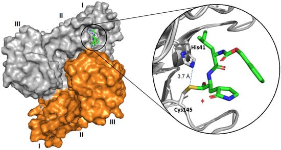 Mpro is a homodimeric cysteine protease, and effective inhibition of the active site relies on the covalent interaction with the catalytic dyad consisting of cysteine residue 145 (Cys145) located on domain II and histidine 41 (His41) located on domain I (Zhang 2020, [,] (Figure 1). Nucleophilic attack of the inhibitor by the cysteine thiolate is preceded by His41-moderated thiol deprotonation, increasing sulfur nucleophilicity []. This reflects a generally accepted two-step mechanism that is different from the mechanism of serine proteases such as chymotrypsin that have a catalytic triad that supports a concerted mechanism. Tight binding of the inhibitor causes a slight conformational change that brings both catalytic residues into proximity, thus initiating covalent interaction with the inhibitor warhead. Promiscuity in Mpro seems to follow the general trend of being somewhat higher than that in serine proteases [], as indicated by the longer distance between the dyad residues, giving rise to various peptide and nonpeptide inhibitor geometries and different warhead chemistries. The PDB currently hosts 294 structures of covalently bound competitive Mpro inhibitors, which serve as a basis for the structural and mechanistic analysis in this chapter. Chemoinformatic analysis indicates that the vast majority of crystallized inhibitors follow Lipinski design rules, including a molecular weight below 500 Da (Mw,aver = 449.5 ± 144.9 g/mol). Aside from covalently bound inhibitors, which are covered in the first part of this chapter, an increasing number of inhibitors that are noncovalently bound in the active site can be found in the recent literature, and these are described in a third subsection. These generally tend to be smaller in size (Mw,aver = 346.8 ± 122 g/mol), as is obvious from the comparative structural analysis of their PDB entries (123 PDB structures in total).