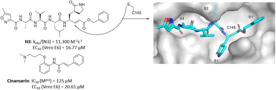 Chemical structure, Mpro binding affinity and antiviral activity of Michael acceptor compounds N3 and cinanserin []. The X-ray structure confirms covalent bond formation of N3′s β-vinyl carbon with the Cys145 thiolate (PBD 6lu7).