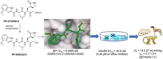 Chemical structure, antiviral, and pharmacokinetic data of PF-00835231 and its drug-precursor phosphate PF-07304814 [,].