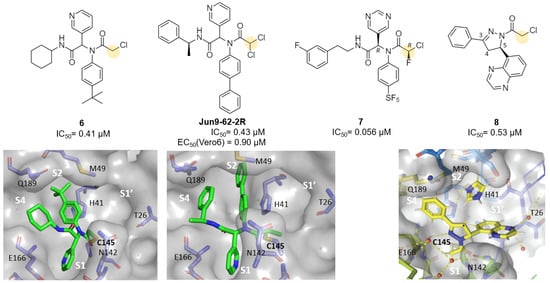α-Chloroacetamides 6 [], Jun9-62-2R [], 7 [], and 8 [] with SARS-CoV-2 antiviral data. X-ray cocrystal structures of 6 (PDB 7mlf), Jun9-62-2R (PDB 7rn1), and 8 [] indicate a covalent bond to the inhibitor’s α-carbon atom (highlighted in structures).