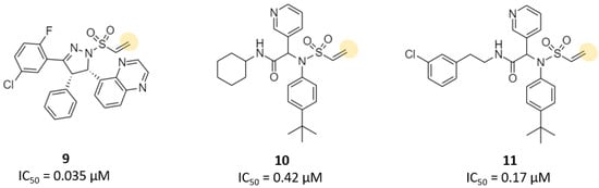 Vinyl sulfones are another known warhead for irreversible cysteine protease inhibition []. Upon reaction with the active site thiolate, they establish a covalent bond with the inhibitor β-vinyl carbon atom. Decorating the discussed pyrazoline skeleton with such a functionality results in the nanomolar SARS-CoV-2 Mpro binder 9 (Figure 7, IC50 = 0.035 µM), which shows promiscuity to other coronaviruses, including SARS-CoV, HCoV-NL63, IBV, and HCoV-229E []. Other nonpeptidic inhibitors with vinyl sulfone warheads have been developed based on the successful α-chloroacetamide 6. Swapping out the warhead gives molecule 10 with a IC50 of 0.42 µM, which was further optimized by tuning the P3 residue to a 3-chlorophenyleth-2-yl group (11; IC50 = 0.17 µM) []. Isothermal titration calorimetry as well as a crystal structure of 10 (PDB 7mlg) confirm covalent bond formation. The orientation of the molecule in the active site is due to the unchanged P1 and P2 residues almost identical with 6.