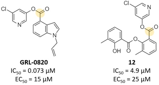 Chemical structure and antiviral data of ester inhibitors GRL-0820 [] and 12 [].