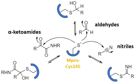 Different reversible Mpro inhibition mechanisms involving α-ketoamides, aldehydes, and nitriles.