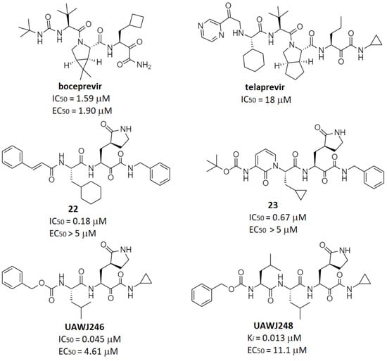 Reversible Mpro inhibitors with ketoamide warhead, 22 and 23 [,], as well as UAWJ246 and UAWJ248 [] are based on the FDA-approved hepatitic C (HCV) antivirals boceprevir [] and telaprevir [].