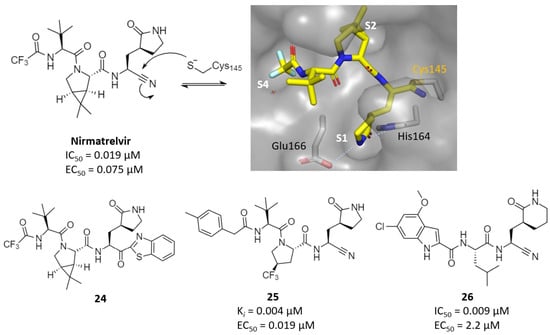 A third category of reversible Mpro inhibitors uses a nitrile warhead to establish a temporary covalent bond with the enzyme. A nucleophilic Cys145 thiolate attack of the electrophilic nitrile carbon results here in the formation of a reversible thioimidate. Although nitrile-based peptidomimetic SARS-CoV-2 inhibitors developed as past (corona)viral defense agents showed only moderate inhibition success [], the nitrile function is a chemically valuable way to reduce the number of hydrogen bond donors in the molecule []. This feature is helpful for the development of orally available drug candidates, as a reduced number of hydrogen bond donor functions increases drug permeability in the gut. Using this chemical masking strategy, Pfizer chemists developed, in a comprehensive drug development program, nirmatrelvir, influenced by structural optimization of the α-hydroxymethyl ketone PF-00835231 and the benzothiazol-2-yl ketone candidate 24 (Figure 12) []. The concept proved successful, with nirmatrelvir showing nanomolar SARS-CoV-2 Mpro inhibition (IC50 = 0.019 µM), a strong antiviral effect (EC50 = 0.075 µM), and no cell toxicity []. The X-ray structure shows thioimidate formation of the inhibitor with Cys145 of the main protease, supported by stabilizing hydrogen bonds of the imine with nearby Gly143 (PDB 7vh8 and 7vlq) []. The choice of an N-terminal trifluoroacetyl group in the drug design is supported by stabilizing contacts with Gln192 in the S4 pocket. In vivo animal tests confirmed desired intestinal permeability features, excellent oral bioavailability, and proper drug clearance (Table 2). A mouse-adapted SARS-CoV-2 (SARS-CoV-2 MA10) model responded with significantly reduced virus levels in the lungs after 4 days of a twice-daily treatment regime with nirmatrelvir (300 mg/kg) compared to the placebo group. Excellent in vitro and pharmacokinetic performance as well as favorable off-target selectivity qualified the drug candidate for clinical trials, consequentially leading to emergency FDA approval of nirmatrevir in December 2021. During the preclinical trials, it was found that coadministration of the anti-HIV drug ritonavir increased drug performance due to ritonavir’s inhibitory action on CYP-mediated metabolism. This ultimately resulted in coformulation of nirmatrelvir with ritonavir in the final drug paxlovid. In light of the mutational adaptivity and widespread transmission of different SARS-CoV-2 variants of concern, it can be seen encouraging that several studies confirmed nirmatrelvir’s ability to efficiently neutralize infection of beta, delta, and omicron variants of the virus in animal models [,,,,]. Regarding effectivity in humans, a manufacturer-conducted study indicated persistent pharmacokinetic performance, viral clearance, and drug safety in healthy participants []. Related studies with renally impaired subjects showed increased peak plasma concentrations of the drug and delayed clearance correlating with severity of renal disease, thus recommending a dose reduction for this impairment group []. Driven by the success of nirmatrelvir, several analogs with adaptations of the P2 and P3 sites have been developed. A related patent by Pfizer identified compound 25 as a strong main protease binder (Ki = 0.004 µM) and effective SARS-CoV-2 antiviral (EC50 = 0.019 µM) []. A different group considered elements of GC376 and its derivatives for their inhibitor optimization screening. Among their synthesized compounds, nitrile 26 was the most active in the inhibition assay (IC50 = 0.009 µM) and potent in reducing viral replication (EC50 = 2.2 µM) [].