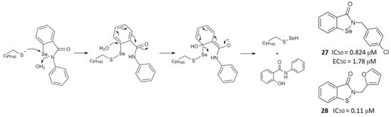 An odd case of covalent inhibition of SARS-CoV-2 Mpro concerns the repurposing studies of the anti-inflammatory agent ebselen, which has been in the inhibitor race since early 2020. Enzymatic testing indicated strong inhibition and antiviral activity of ebselen (IC50 = 0.67 µM, EC50 = 4.67 µM, VeroE6) [,]. Two inhibition mechanisms are discussed in the literature: covalent attachment to and ultimate selenylation of Cys145 [] and allosteric inhibition at a dimerization site (discussed later). Covalent inhibition proceeds through SN-type opening of the benzisoselenazol ring and subsequent hydrolysis, releasing a phenolic byproduct and the selenylated cysteine sulfur, as suggested by DFT and mass spectrometric analysis (Figure 13) [,]. The final sulfur selenium adduct was confirmed by X-ray crystallography (PDB 7bak) []. Considering the possibility for plural inhibition within Mpro, ebselen analogs were designed and tested. One design avenue considered ebselen derivatives with a modified nitrogen substituent [], where again it was found that halide substitution beneficially influences inhibitor properties. The most active compound from this series, 27, showed similar potency to that of the parent ebselen and had about three times improved antiviral activity (EC50 = 1.78 µM; VeroE6). Substitution of the selenium atom for sulfur gives the isosteric compound ebsulfur, which also acts as a potent Mpro inhibitor. Among a series of analogs, compound 28 bound with an IC50 of 0.11 µM to the target; however, antiviral and pharmacokinetic data have not been reported yet.