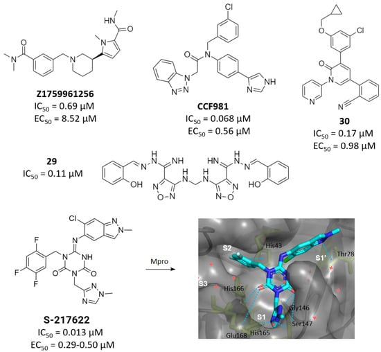 A virtual screening study performed by Yang et al. identified Z1759961256 (Figure 14) as one of six hits with micromolar Mpro potency and viral activity against SARS-CoV-2 []. Similarly, in the optimization of the molecular library probe ML300 in a comprehensive study design, CCF981 evolved as lead compound with a strong Mpro inhibition capability (IC50 = 0.068 µM) and a pronounced antiviral effect (EC50 = 0.56 µM; VeroE6) []. The drug binds well into Mpro’s active site cavity with the imidazole system pointing towards S1′, the benzotriazole unit in S1, and the m-chlorobenzene occupying S2, as abstracted from the binding modes of structurally similar analog crystal structures. Following the dual inhibitor approach to maximize the antiviral effect, Elseginy et al. synthesized inhibitor 29 (Figure 14) after mapping a >50,000 compound library for structural hits []. In vitro tests identified 29 not only as a potent Mpro binder (IC50 = 0.11 µM) but similarly as a good inhibitor of PLpro and human furin protease. Cell assays indicated cytotoxicity in mammalian cells that were overcome by synthesis of analogs of 29. Inspired by the weak anti-SARS-CoV-2 Mpro activity of the antiepileptic perampanel, Zhang et al. synthesized and tested 27 structural analogs in their search for better inhibitory activity []. While most synthesized compounds showed sub-micromolar Mpro inhibition, VeroE6 cell assays indicated considerate toxicity. One compound (30), however, stood out, having a low Mpro IC50 of 0.17 µM, potent antiviral effect (EC50 = 0.98 µM), and displaying no cell toxicity within the tested concentration range (CC50 > 100 µM). The crystal structure of a related analog shows the cloverleaf-like molecular structure occupying three subpockets of the protease (PDB 7l11). Using an in-house structural library, Unoh et al. recently discovered another cloverleaf-like structure that shows beneficial anti-SARS-CoV-2 properties and binds noncovalently in the active site of Mpro []. Virtual screening with predefined filters that include two hydrogen bond acceptors in S1 and a hydrophobic element in S2 narrowed down the selection of hit structures suitable for biological screening. Among them, the compound S-217622 displayed very strong binding to Mpro (IC50 = 0.013 µM) and pronounced antiviral effect in the plaque reduction assay (EC50= 0.37 µM). Further biochemical assays confirmed that S217622’s antiviral activity extends to common SARS-CoV-2 variants, including the omicron strain (EC50= 0.29–0.5 µM), while other proteases, including cathepsins and thrombin, remain uninhibited. In the X-ray structure, the 1,3,5-triazine-2,4(1H,3H)-dione core sits in the middle of the catalytical site, with the three wing-like substituents reaching in S1′, S1, and S2 pockets (PDB 7vu6). A tight fit is achieved by a dense H-bond network involving Gly146, Ser147, His165, and Glu168 of the enzyme as well as π–π interactions between His43 and the aromatic P2 inhibitor moiety (Figure 14). The superior in vitro performance of S-217622 stimulated in vivo testing in mice infected with SARS-CoV-2 Gamma strain, where viral titers in lung homogenates were determined 12 h after oral dose of S-217622 and 24 h after infection. The drug demonstrated a peak plasma concentration that at all tested doses (2–32 mg/kg single dose, P.O.) was above the protein-adjusted EC50, thereby reducing the viral titer at the highest two doses to the detection limit (1.8 log10[TCID50]/mL). Full pharmacokinetic profiling in hamster revealed a stable concentration level (Cmax = 62 µM at 30 mg/kg single dose P.O., t0.5 = 1.2 h) and reduced lung damage from acute SARS-CoV-2 infection in hamster recipients [].