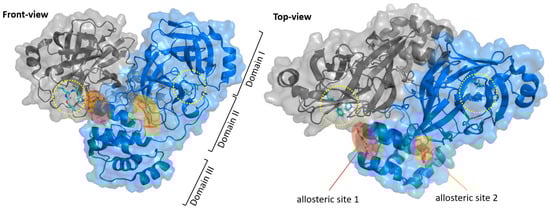 The dimeric structure of Mpro is vital for activity. Allosteric inhibitor binding sites are located near the dimerization site (allosteric site 1) or between domains (site 2) to impair conformational movement. The location of the active site in each monomer is indicated with a yellow circle.