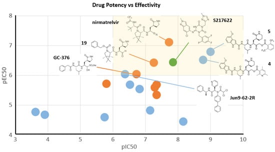 Recently, there has been renewed interest in developing optimized peptide and peptide-mimetic inhibitors based on the initial success of Michael acceptor warheads. The exchange of the α,β-unsaturated carbonyl for hydroxymethyl and alkoxymethyl ketones gave rise to another class of potent Mpro inhibitors [,]. Reaction of these highly electrophilic ketones with the active site thiolate resulted in a hemithioketal that, unlike Michael-type inhibitors, possesses a coordination-relevant OH group supporting additional stabilizing interactions with the active site residues. Among these, the hydroxymethyl ketone PF-00835231 (Figure 4) has been identified as a nanomolar Mpro binder (IC50 = 0.007 µM) and effective antiviral (EC50 = 35.9µM, Vero6, USA/WA1/2020), the potency of which can be increased almost 80-fold by the application of an efflux inhibitor (EC50 = 0.46µM, 2µM CP100356; Table 1). Thermal shift assays as well as an X-ray crystal structure (PDB 6xhm) confirm tight binding to the active site, including a dense array of stabilizing hydrogen bonds in S1′ (Figure 4) []. The compound is safe in cell assays and displays pharmacokinetic profiles in animals (rat, dog, monkey) that were beneficial for preclinical studies (Table 1). Solubility issues and low oral bioavailability (>2% in rat, dog, monkey) can be overcome by transformation of PF-00835231 into its phosphate prodrug PF-07304814, which is suitable for intravenous injection formulation, releasing about 75% active drug by human alkaline phosphatase cleavage []. Extension of the C-terminal alcohol by an alkyl or aryl group results in inhibitors with an α-acyloxymethyl ketone warhead. Unlike the hydroxymethyl ketone PF-00835231, acyloxymethyl ketones possess an electrophilic α-carbon that can be attacked by the active site thiolate, resulting in an irreversible covalent bond, as confirmed by the cocrystal structure of 4 (PDB 7mbi; []). By experimental variation, benzoyloxymethyl ketones were identified as the most potent Mpro inhibitors, with 2,6-disubstituted aryl rings additionally lowering the pKa of the corresponding acid, thus reducing IC50 values down to single-digit nanomolar (Figure 5). EC50 values of 4 and 5 are 0.3 and 0.16 µM, respectively, with no observed cell toxicity up to the highest tested concentration (200 µM) []. With a mouse plasma half-life > 4 h, logD of 4.4, and basolateral-to-apical permeability > 20 × 10−6 cm/s, 4 promises beneficial ADME properties and nondiscriminant thiol reactivity. The six-membered lactam ring seems only to have a marginal effect on the potency of these inhibitors. While highly selective for cysteine proteases over other cellular proteases, these inhibitors act promiscuous towards human cathepsin B and S with IC50′s for 4 of 0.2 µM for CatB and 0.05 µM for CatS.
