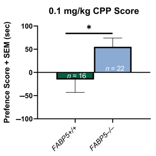 Exp 1 (0.1 mg/kg Nicotine CPP): Potential sex differences in the delta preference scores between the FABP5+/+ and FABP5−/− groups were assessed as previously described, and none were observed (p > 0.05). The sexes were then collapsed to compare the genotypes within the groups, and the results showed that at the 0.1 mg/kg nicotine dose, the FABP5−/− mice had a significantly higher preference score for the nicotine-paired chamber, t(35) = 2.18, * p = 0.036, compared with their FABP5+/+ counterparts (see Figure 1).