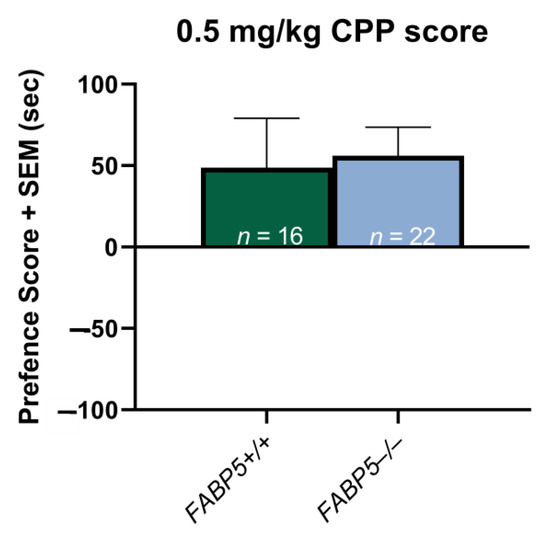Exp 2 (0.5 mg/kg Nicotine CPP): Potential sex differences in the delta preference scores between the FABP5+/+ and FABP5−/− groups were assessed as previously described, and none were observed (p > 0.05). The sexes were then collapsed to compare the genotypes within the groups, and the results showed no significant difference (p > 0.05) between the FABP5−/− mice and their FABP5+/+ counterparts (see Figure 2).