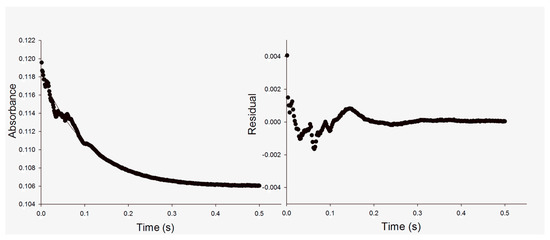 Left panel: representative stopped-flow trace of MtInhA (15 μM) reaction showing decrease in absorbance at 340 nm and 25 °C upon conversion of NADH (14 μM) and DD-CoA (225 μM) into NAD+ and dodecanoyl-CoA over the course of the experiment (left panel). The pre-steady-state time course was fitted to a single-exponential decay equation (Equation (2)). Note: all concentration values for enzymes and substrates are those used for mixing chamber concentrations. Right panel: the calculated residual values plotted against time (s) using Equation (2).