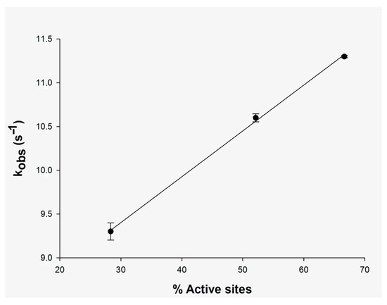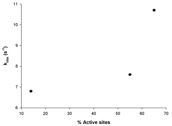 The dependence of kobs values on the degree of occupancy of active sites of MtInhA with substrate DD-CoA. The bars in the plot represent the errors.