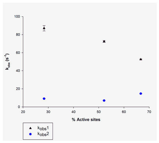 The dependence of kobs values derived from data fitting to a double-exponential function (Equation (3)) on the degree of occupancy of active sites of MtInhA (15 μM) pre-incubated with NADH concentrations of 5 μM (28% occupancy), 10 μM (52% occupancy) and 14 μM (66% occupancy). The (▲) represents the kobs1 for the fast phase of the biphasic reaction (in black), and (●) represents the kobs2 for the slow phase of the biphasic reaction (in blue). The bars in the plot represent the standard errors of data fitting to Equation (3).