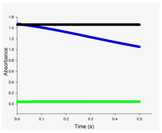 Stopped-flow trace for substrate consumption by measuring the decrease in absorbance at 340 nm at 25 °C for MtInhA (10 μM). Data were fitted to Equation (2) (single-exponential decay). The upper time course (in black) is for negative chemical control in which 100 mM Pipes pH 7.0 buffer in one syringe was mixed with NADH (600 μM) and DD-CoA (450 μM) in another syringe (absence of enzyme). The lower time course (in green) is for mixing enzyme (20 μM) in one syringe mixed with 100 mM Pipes pH 7.0 buffer in another syringe (absence of substrates). The time course shown in blue is for the chemical reaction upon mixing MtInhA (20 μM) in one syringe with NADH (600 μM) and DD-CoA (450 μM) in another syringe. Note that the mixing chamber concentrations are 10 μM MtInhA, 300 μM NADH and 225 μM DD-CoA.