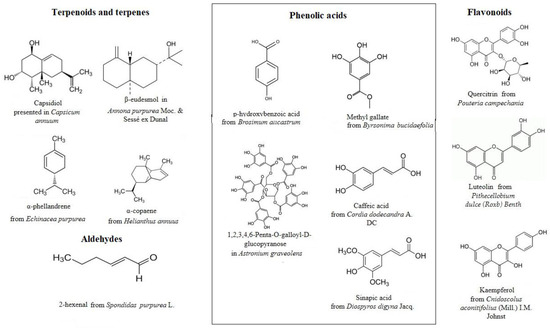 | Echinacea purpurea (Purple coneflower) | Asteraceae | whole plant | α-phellandrene, camphene, limonene | present (not specified) | pyrrolizidine alkaloids tussilagine and isotussilagine | quercetin, kaempferol, isorhamnetin | Coumaric acid | [40,41,42,43,44] |