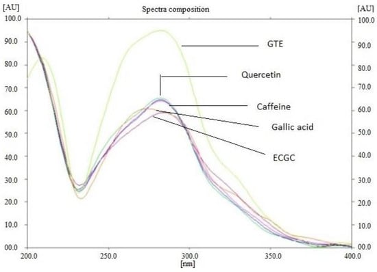 Overlay absorption spectra of standard (EGCG, gallic acid, caffeine, and quercetin) and GTE extract.