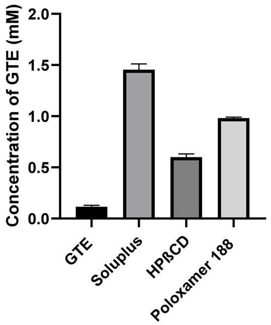 The phase solubility of the GTE was analyzed in distilled water. It was observed that when increasing the concentration of different carriers, viz., Soluplus®, Poloxamer 188,and Hydroxy Propyl-β-Cyclodextrin (HPβCD) within the range of 1 to 5 mmol, the solubility of the GTE was also discovered to be rising in all the carriers, as shown in Figure 3. As compared to all the other carriers, there was a significant increase in the solubility of the GTE using Soluplus®. At a concentration of 5 mM of Soluplus®, the solubility of the GTE was found to be 1.473 mM, whereas the solubility of the GTE was found to be 0.113 mM. Thus, 13.03 times higher GTE solubility was found with Soluplus®. The reason for this could be the amphiphilic characteristics of Soluplus and the presence of a large number of hydroxyl groups, making it water-soluble. It forms micelles at lower concentrations with a CMC value of 0.0007% (w/v) at 37 °C, which contributes to the formation of stable micelles. The lower HLB value of Soluplus as compared to Poloxamer 188 makes it more prone to forming stable micelles, thereby improving the apparent solubility of GTE. The same findings were reported by Naharros-Molinero et al. [44].
