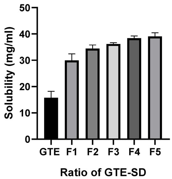 The saturation solubility of GTE and various ratios of GTE-SD were determined in water (Figure 4). The GTE-SD with a 1:6 ratio showed a significant increase (p < 0.001) in the solubility of GTE (36.2 mg/mL) as compared to the pure GTE (15.75 mg/mL). As the ratio of GTE-SD increased, the solubility of GTE also increased considerably. This might be due to an increase in micelle production with an increase in the GTE-SD ratio. Although GTE is basically hydrophilic in nature, it also contains essential oils and other hydrophobic substances, which add on to the total composition of GTE. Micelles can serve as transporters for hydrophilic substances. The hydrophilic substances exist close to the micelle’s outer shell and can easily interact with the water molecules while being held in place by the micellar structure, thereby further improving the solubility of GTE.