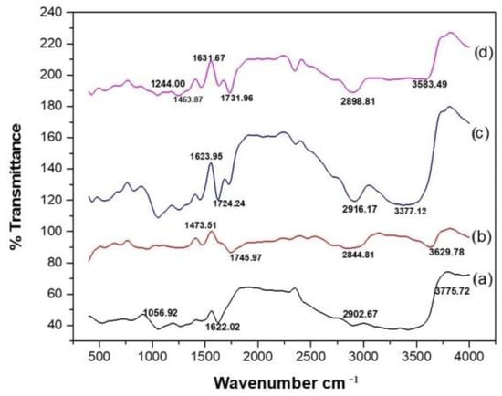 The IR spectrum of GTE, Soluplus®, the physical mixture of GTE and Soluplus®, and GTE-SD is shown in Figure 5. The IR spectrum of GTE in Figure 5a extract exhibits a peak at 3775.72 cm−1, indicating the presence of OH groups of alcohol, phenols, and N–H stretching in amines. The C–H stretching in alkanes appears at 2902.67 cm−1. The presence of a sharp peak at 1622.02 cm−1 demonstrates the existence of the C=O group of aryl ketone. One band at 1056.92 cm−1 indicates the presence of a C–O stretch of the ester group. The IR spectrum of Soluplus® in Figure 5b shows a broad peak at 3629.78 cm−1 (OH stretch). Major absorption peaks at 2844.81 cm−1 indicate bands due to aromatic C–H stretching [45]. The peak at 1745.97 cm−1 indicates the existence of ester carbonyl stretching. A peak at 1473.51 cm−1 is observed due to C–O–C stretching. The IR spectrum of the physical mixture of GTE and Soluplus® shown in Figure 5c is characterized by the presence of major absorption peaks at 2916.17 cm−1 due to C–Hstretching. The peaks at 1623.95 cm−1 and 1724.24 cm−1 show the occurrence of C=O stretching and C=O ester carbonyl stretching, respectively. The peak at 3377.12 cm−1 indicates the occurrence of an OH group. The IR spectrum of the physical mixture of GTE and Soluplus® demonstrates the existence of both components; the entire IR spectrum suggests that there isno chemical interface between them. The IR spectrum of the solid dispersion in Figure 5d exhibits peaks at 3583.49 cm−1 due to the OH group, and a sharp peak at 1731.96 cm−1 is observable in the spectrum, indicating the existence of an ester carbonyl group; the peak at 1631.67 cm−1 shows C=O stretching, and peaks at 1244.00 cm−1 and 1463.87 cm−1 indicate the existence of (C–O) and (C=C). The peak at 3583.49 cm−1 corresponding to the OH group appears consistently in the entire spectrum but was slightly shifted and became broader due to the formation of hydrogen bonding. The presence of a carbonyl (C=O) and alkane (C–H) group in GTE enables the formation of hydrogen bonds with the hydroxyl group of Soluplus® during the formation of solid dispersion, causing a reduction in the intensity of the carbonyl group in the formulation [46]. However, no additional peak was observed in GTE-SD, indicating an absence of any chemical interaction between the GTE and polymer. The IR spectrum of the solid dispersion shows the presence of broad and reduced peaks as compared to the sharp peak observed for the GTE and Soluplus®.
