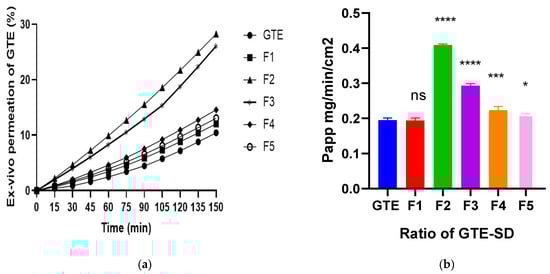 (a) Ex vivo permeation of GTE from GTE-SD; (b) the Papp of various ratios of GTE-SD. Data analyzed using one-way ANOVA followed by Sidak’s multiple comparison test (* p < 0.05, *** p < 0.001 **** p < 0.0001 and ns non significant).