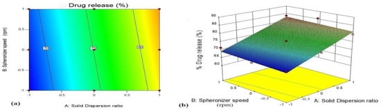 (a) Counter plot; (b)surface response plot showing effect of GTE-SD and spheronizer speed on % drug release.