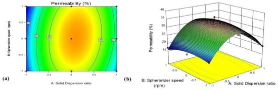 (a) Counter plot; (b)surface response plot showing effect of GTE-SD and spheronizer speed on ex vivo% drug permeation.