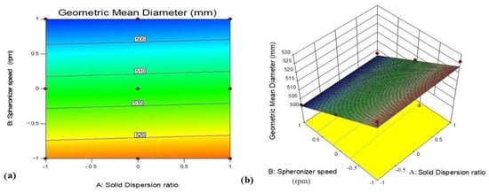 (a) Counter plot; (b)surface response plot showing effect of GT-SD and spheronizer speed on geometric mean diameter of pellets.