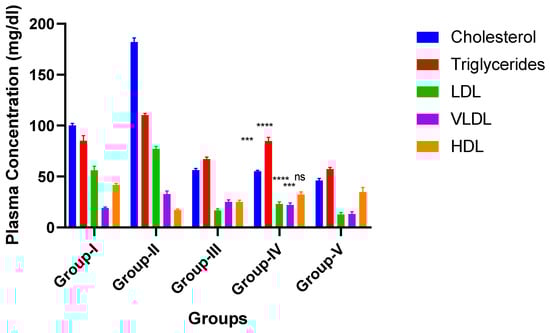 Lipid blood profile in Wistar rats from in vivo study (The data are expressed as mean ± SD). Data analyzed using Dunnett’s multiple comparisons test (*** p = 0.0001 and **** p < 0.0001; ns, non significant; Group IV compared to Group V).