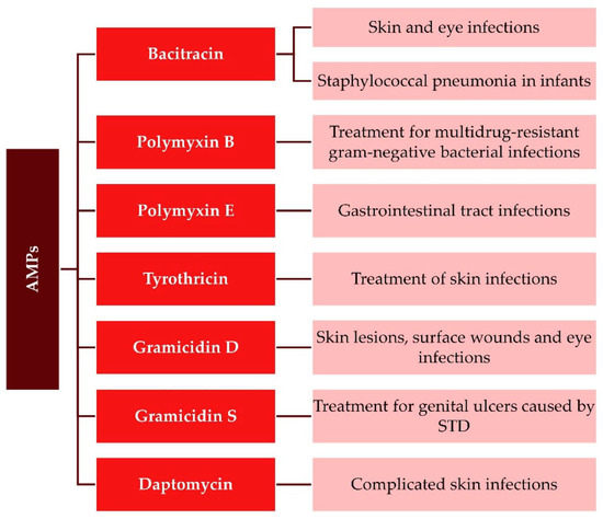 Daptomycin, gramicidin, and colistin (polymyxin E) are approved for clinical use and are AMPs acting on the microbe’s membrane [79].