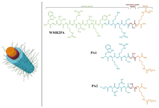 Peptide amphiphiles (PAs) synthesized as molecules containing a hydrocarbon chain attached to a peptide segment self-assemble into cylindrical nanostructures capable of enhanced antimicrobial performance. Reprinted with permission from [20]. Copyright 2019 American Chemical Society.