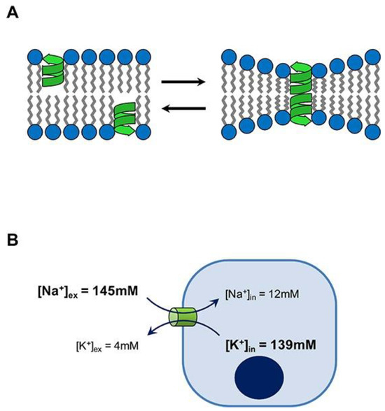 Gramicidin A molecules acquire a helix conformation in bilayer membranes (A); Gr dimers function as channels that allow passive diffusion of cations such as Na+ and K+ in accordance with their concentration gradients; thereby, Na+ influx and K+ efflux take place (B). Reproduced from [109].