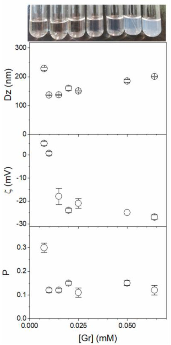 As an interesting example of assemblies or combinations involving Gr A, a recent development was the basic demonstration that Gr self-assembles in water dispersions as nanoparticles (NPs) over a range of Gr concentrations so that inner molecules in the NPs gain protection from the outer medium [21]. Figure 8 shows Gr NPs visualized by means of scanning electron microscopy (SEM); their photos in water dispersions; and their hydrodynamic diameters (Dz), zeta-potentials, and polydispersity (P) over a range of Gr concentrations, as determined via dynamic light scattering (DLS) [21].