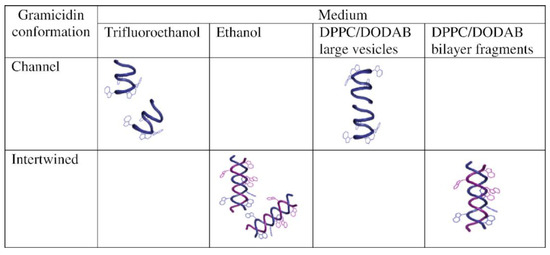 The interaction between Gr and dipalmitoylphosphatidylcholine (DPPC)/dioctadecyldimethylammonium bromide (DODAB) 1:1 large unilamellar vesicles (LVs) or bilayer fragments (BFs) was studied, revealing that the Gr dimeric channel occurred in LVs, whereas Gr in BFs displayed an intertwined dimeric, non-channel Gr conformation; this example illustrated Gr conformations assumed in different media, such as bilayer vesicles or bilayer fragments (see Figure 9) [122].