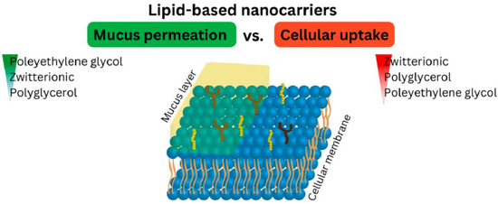 The use of advanced formulations involving micro/nanoparticles [135,137,147,148,149], hydrogels [150,151], particle/hydrogel combinations [152], and polymer-based scaffolds could protect peptides from proteolysis, maintaining their activity [153,154]. Oral peptide delivery using liposomes, polymeric nanoparticles, polysaccharides, hydrogels, and self-emulsifying systems as potential therapeutic approaches have been comprehensively reviewed [155,156]. Among the most promising formulations are lipid-based nanocarriers such as emulsions, lipid nanoparticles, liposomes, and micelles because gastrointestinal (GI) peptidases, as well as sulfhydryl compounds such as glutathione and dietary proteins, are too hydrophilic to enter the lipophilic phase of these carriers; the incorporated therapeutic peptide is thereby protected from enzymatic degradation as well as unintended thiol/disulfide exchange reactions. Nanocarriers (<200 nm in size) with PEG or zwitterionic surfaces can permeate the mucus layer, reach the absorption mucosal membrane, and be taken up by endocytosis or transcytosis or by simply fusing with the cell membrane, followed by releasing their cargo into the systemic circulation [157]. Recently, zwitterionic (ZW), polyglycerol (PG), and polyethylene glycol (PEG) surfactant oil-in-water nano-emulsions were shown to diffuse across the mucus barrier on intestinal mucosa and also be taken up by the epithelial cells of the intestinal mucosa, as illustrated by Figure 10; in this case, the lipid-based nanocarriers with PEG displayed a lower uptake by the epithelial cells than the ZW- and PG-based carriers [158].