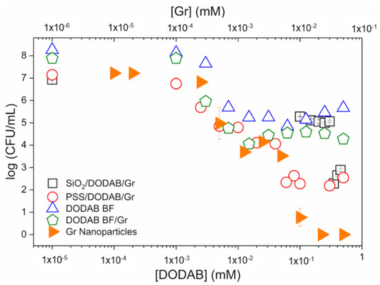 Staphylococcus aureus (107–108 CFU/mL) viability, in CFU/mL, after interacting for 1 h with gramicidin (Gr) nanoparticles or other Gr formulations in dioctadecyl dimethylammonium bromide (DODAB) bilayers. Cell viability in the presence of Gr in DODAB–supported bilayers on silica (SiO2/DODAB/Gr) [163]. Gr in DODAB–supported bilayers on polystyrene sulfate (PSS) nanoparticles (PSS/DODAB/Gr) [137] and DODAB bilayer fragments (DODAB BF) [164] or DODAB BF/Gr [135]. In the DODAB BF dispersions, Gr dimers in the channel conformation have been previously described [135,137]. The SiO2/DODAB/Gr stock dispersion was prepared with 2 mg/mL silica, 0.5 mM DODAB, and 0.05 mM gramicidin, yielding Dz = 280 ± 5 nm, p = 0.20 ± 0.02, and ζ = 45 ± 4.