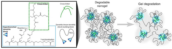 Scheme for a degradable nanogel based on a polyester polymer functionalized with reactive sites convertible into either cross-linkers (green) or carboxylic acid moieties (blue); the charged and cross-linked cores are surrounded by a PEG corona (grey); the polyester network is degradable at physiological pH and ionic strength (right). Reprinted from [178], copyright (2023), with permission from Elsevier.