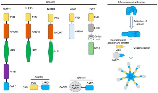 Domain organization and activation of the most known canonical inflammasomes. On the left, the NLRP1, NLRP3, NLRC4, AIM2, Pyrin, ASC, and CASP1 domains’ organization. On the right, a schematic view of the canonical activation process. The typical inflammasome contains three components: sensors, adapters, and effector proteins. Sensors oligomerize upon activation and recruit adapter and effector proteins to the inflammasome complex. Modified from Christgen et al. [10] and Hamarsheh and Zeiser [11].