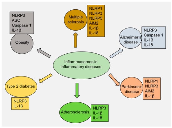 Inflammasomes play a significant role in various inflammatory diseases [23] (Figure 3). The involvement of inflammasomes in a wide range of inflammatory diseases has been reported [23,73,74]. In this section, we discuss the role of inflammasome complexes in various inflammatory diseases, including multiple sclerosis (MS), experimental autoimmune encephalomyelitis, Alzheimer’s disease (AD), Parkinson’s disease (PD), atherosclerosis, type 2 diabetes (T2D), and obesity (Figure 3). Limited but emerging data suggest that inflammasomes may play a role in the development and progression of other inflammatory conditions, including rheumatoid arthritis (RA), inflammatory bowel disease (IBD), gout, psoriasis, and systemic lupus erythematosus (SLE) [75].