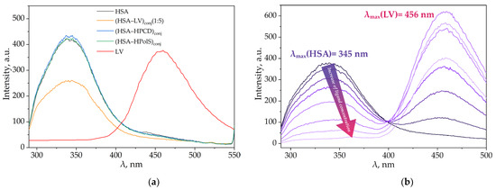 3.3.1. Impact of HPCD, HPolS, and Conjugate Formation on the Fluorescence Spectra of HSA and LV