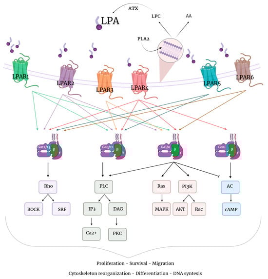 Schematic representation of LPA production and signaling. Phospholipase A2 (PLA2) generates lysophosphatidylcholine (LPC) from membrane lipids, which is then converted into lysophosphatidic acid (LPA) by autotaxin (ATX). LPA acts through six transmembrane G-coupled protein receptors (LPAR1-6), which activate several signaling pathways through the activation of different G proteins. The cellular responses elicited by LPA are involved in proliferation, survival, migration, cytoskeleton reorganization, differentiation, and DNA synthesis.