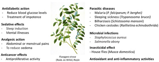 In conclusion, this study underlined the pharmacological benefits of the plant F. virosa, which is largely used in traditional medicine in a large part of the world. This Flueggea species is a phytochemical reservoir, with a large number of flavonoids and alkaloids isolated from different parts of the plant. The two emblematic compounds, namely, bergenin and securinine, along with many derivatives and analogs, are at the origin of the various pharmacological activities, notably anti-inflammatory, antioxidant, antiparasitic, antidiabetic, anticancer and analgesic effects. A remarkable feature of F. virosa is the presence of norsecurinine oligomers, such as the anticancer dimer flueggine B, which possibly acts as a tubulin binder. The nutritional and pharmacological properties of the plant, notably the white berries consumed locally, shall be investigated further. In today’s rapidly changing world, with a major need to provide healthy food to a growing human population, it is important to accentuate access to a potential new source of food. The fruit of F. virosa (and other Flueggea species) represents an option to consider but within a frame of ecological protection.