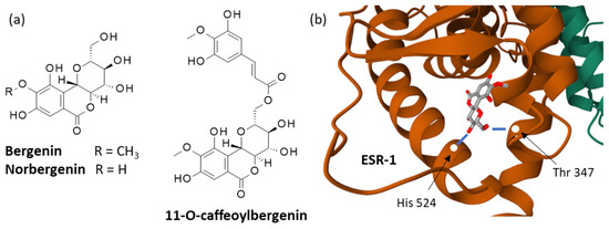 (a) Structures of bergenin, norbergenin and 11-O-caffeoylbergenin isolated from the leaves of F. virosa. (b) Molecular model of bergenin bound to ESR-1 (estrogen receptor 1), with two major hydrogen bonds between the drug and residues Thr347 and His524 of ESR-1 [128].