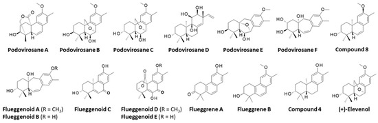In the same group of podocarpane derivatives, flueggrenes A and B (Figure 4) are two trinorditerpenes that were also isolated from the roots of F. virosa. They display a weak anti-HCV infection activity (IC50 = 13.0 and 26.3 µM, respectively) and they are both able to inhibit elastase release by human neutrophils in response to cytochalasin B (IC50 = 4.3 and 9.6 µM, respectively) [160]. In the same vein, the authors also described a series of dinorditerpenes found in F. virosa roots, including a few potent compounds. An interesting molecule is the podocarpatriene 11 (7α,20-epoxy-3α-hydroxy-12-methoxy-13-methyl-ent-podocarp-8,11,13-triene) with an intramolecular ether linkage. This compound was found to reduce HCV infection (IC50 = 6.6 µM) while being non-cytotoxic to Huh7.5 cancer cells (IC50 > 400 µM) [161]. Its high therapeutic index (TI = 56) encouraged further studies, as well as the total synthesis of the compound renamed (+)-elevenol (Figure 4) and that of a close analog named (+)-przewalskin [162]. There is now a convenient synthetic procedure to access these antiviral compounds. In fact, podovirosane B is a 6-hydroxy derivative of (+)-elevenol.