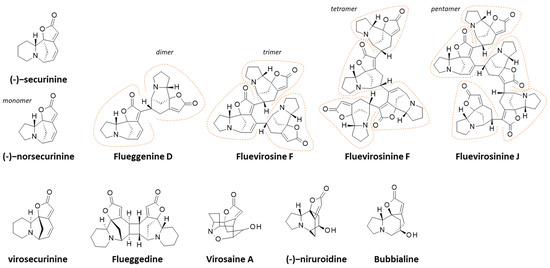 Flueggea (or Securinega) alkaloids have been studied for more than half a century. It started in the mid-1950s with the isolation of securinine from Securinega suffruticosa (Pall.) Rehd. in Russia [169], followed by the discovery of virosecurinine from F. virosa in 1963 [170] (Figure 5). Over the past sixty years, many alkaloids have been identified from all parts of plants collected in different territories. The plant generates a multitude of alkaloids, including oligomers biosynthesized from (-)-norsecurinine as a monomeric precursor. Dimers, trimers, tetramers and pentamers were identified, such as flueggenines C and D (dimers), fluevirosine D (trimer), fluevirosinine A (tetramer) and fluevirosinines G–J (pentamers), all from F. virosa. Many alkaloid-related studies were performed with the species S. suffruticosa, with a wide range of structures [171,172,173]. Here, we focus on selected alkaloids from F. virosa only.