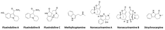 Apart from the largely studied securinine, the pharmacological effects of all other alkaloids in the series were superficially investigated. Usually, one or two isolated tests were performed, and no comparison can be made between the series. Nevertheless, one molecule emerged from our analysis, namely, the dimeric indolizidine compound flueggine B, which revealed potent antiproliferative activities against two breast cancer cell lines (MCF-7 and MDA-MB-231 cells with IC50 values of 135 and 147 nM, respectively), whereas the analog flueggine A was more than 400-fold less active (IC50 values of 60 and 68 µM, respectively). Flueggine B is considerably more potent than other compounds that were also tested against the same cell lines, such as dimeric indole fluevirines E and F, both of which were almost inactive (41% growth inhibition with fluevirine F at 40 µM) [186] (Figure 6). Another indolizidine alkaloid dimer, namely, flueggedine (Figure 5), showed no activity against the two identical cell lines MCF-7 and MDA-MB-231 [183]. Other related products were isolated from the fruit of the plant, notably the dimers norsecurinamine A and B (Figure 7), but their pharmacological properties are not known at present [202]. The indole alkaloids named flueindolines A–C were also obtained from the ripe fruit of F. virosa. Flueindolines A and B are tricyclic indoles, whereas flueindoline C is a spirooxindole derivative; they possibly derive from tryptophane [187] (Figure 7).