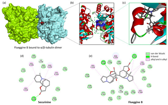 Molecular model of flueggine B (Flg-B) bound to α/β-tubulin dimer (PDB: 5FNV). (a) A surface model of α/β-tubulin with bound Flg-B. The α-helices (in red) and β-sheets (in cyan) are shown. (b) A close-up view of Flg-B bound to the α/β-tubulin interface with the solvent-accessible surface (SAS) surrounding the drug-binding zone (color code indicated). (c) A detailed view of the Flg-B binding site. (d,e) Binding map contacts for securinine and Flg-B bound to α-tubulin (color code indicated). The docking analysis was performed as recently described using the GOLD docking procedure and the following flexible amino acids around the binding cavity: Phe135, Ser135, Phe169, Cys200, Phe202, Ser241, Leu242, Phe255, Cys316 and Lys 352 [210,211].
